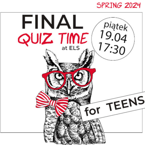 Opublikowano 9 kwietnia 2024 QUIZ TIME FINAL Wielki Finał ligi quizowej w ELS Zabawa dla grup młodzieżowych. Zapraszamy w piątek, 19 kwietnia o godzinie 17:30! Zapisujecie się indywidualnie i […]